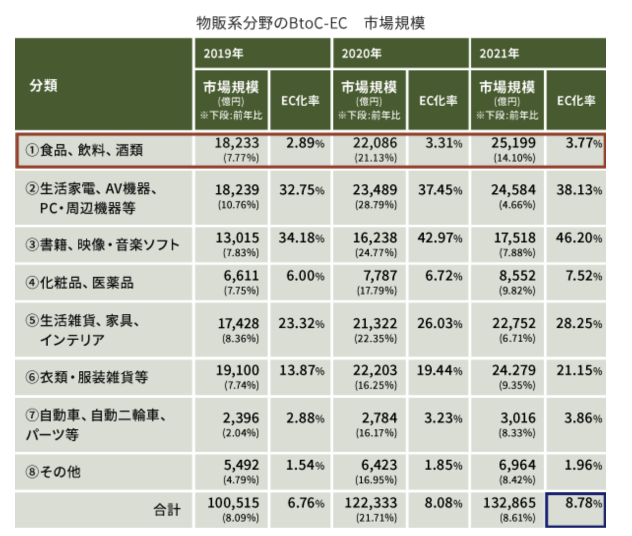 2021年の「食品、飲料、酒類」分野のEC化率は3.77%に留まっています。